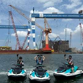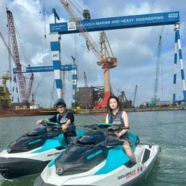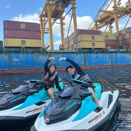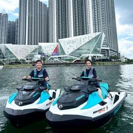 Itinerário: Experiência de condução autónoma de jet ski SEA-DOO, 26 quilómetros de ida e volta, duração estimada de 60 minutos / 1 hora, com partida da marina de Senibong Cove 2. Woodlands Checkpoint 3. Sembawang Park 4. Terminal de ferry The Zon 5. Praia de Stulang 6. RTS Link 7. R&F Mall 8. Porto de Johor 9. Teluk Jawa