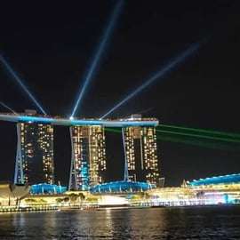 Visita o Marina Bay Sand's SkyPark, uma estância integrada em frente à Marina Bay, em Singapura. Adora uma vista de 360 graus do horizonte iluminado de Singapura, chegando às ilhas Riau, na Indonésia.