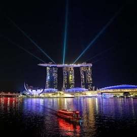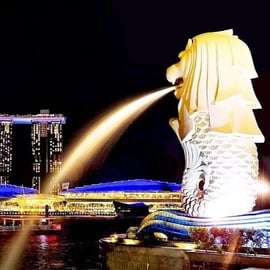Às 18h30, embarca num cruzeiro panorâmico pelo rio Singapura. Aprecia o horizonte cintilante da cidade enquanto passa por marcos como o Marina Bay Sands, o Merlion Park e a Esplanade. O rio oferece o ponto de vista perfeito para apreciar as maravilhas arquitetónicas da cidade. Este espetáculo deslumbrante de fontes dançantes, projeções de luz e música é imperdível, oferecendo uma visão única da modernidade de Singapura.